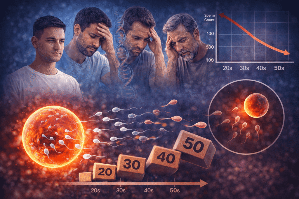 As men enter their 30s and 40s, sperm quality and motility begin to decline. The risk of genetic abnormalities also increases, which are recognized among male infertility causes. After the age of 45, testosterone levels drop more significantly, affecting overall male reproductive health and fertility potential.