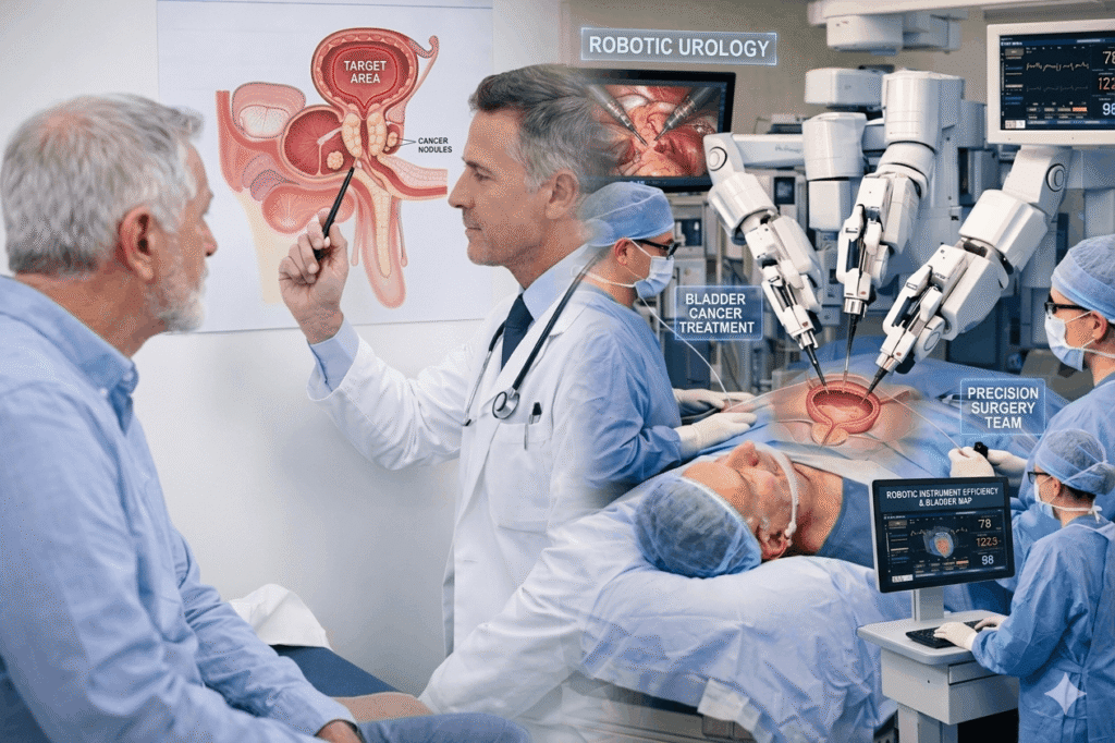 Bladder cancer is another condition where surgical precision is extremely important. In many cases, urinary bladder cancer treatment may involve removing affected tissues while preserving bladder function where possible. In advanced cases, a robotic cystectomy (removal of the bladder) may be required, followed by reconstruction of the urinary tract.